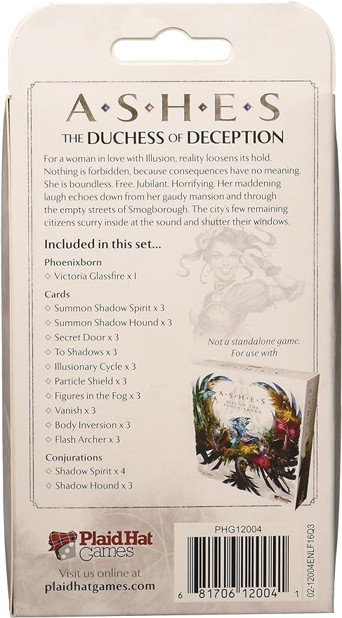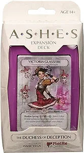 Ashes: The Duchess of Deception, which features new Phoenixborn Victoria Glassfire, is a full, ready-to-play Ashes expansion deck including two conjurations. Victoria requires ten Illusion (purple) dice to play, which are included in the Ashes: Rise of the Phoenixborn base set.