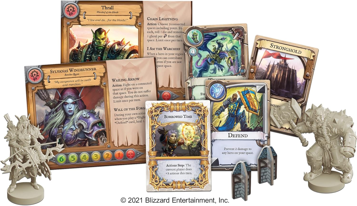 In more detail, players team up as legendary heroes from across Azeroth, each with their own unique abilities to help in and out of combat. Heroes such as Thrall, Warchief of the Horde; Varian Wrynn, King of Stormwind; Sylvanas Windrunner, Banshee Queen of the Forsaken; and many more are at your fingertips. As the Scourge grows, more undead will populate the board. Throw dice as you enter into battle against the hordes of ghouls and ferocious abominations, using hero cards to add power to your attacks, block incoming assaults, heal wounds, take mounts to far off spaces, and so much more.