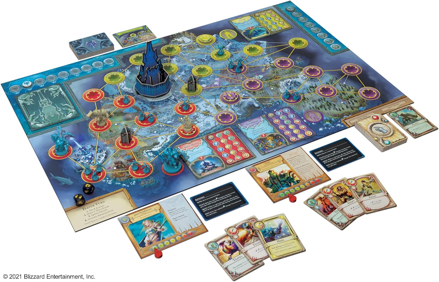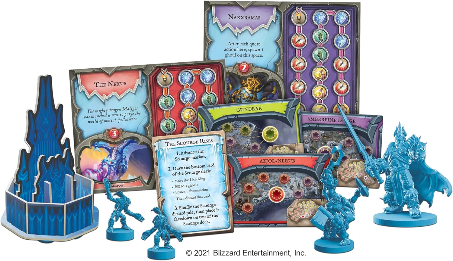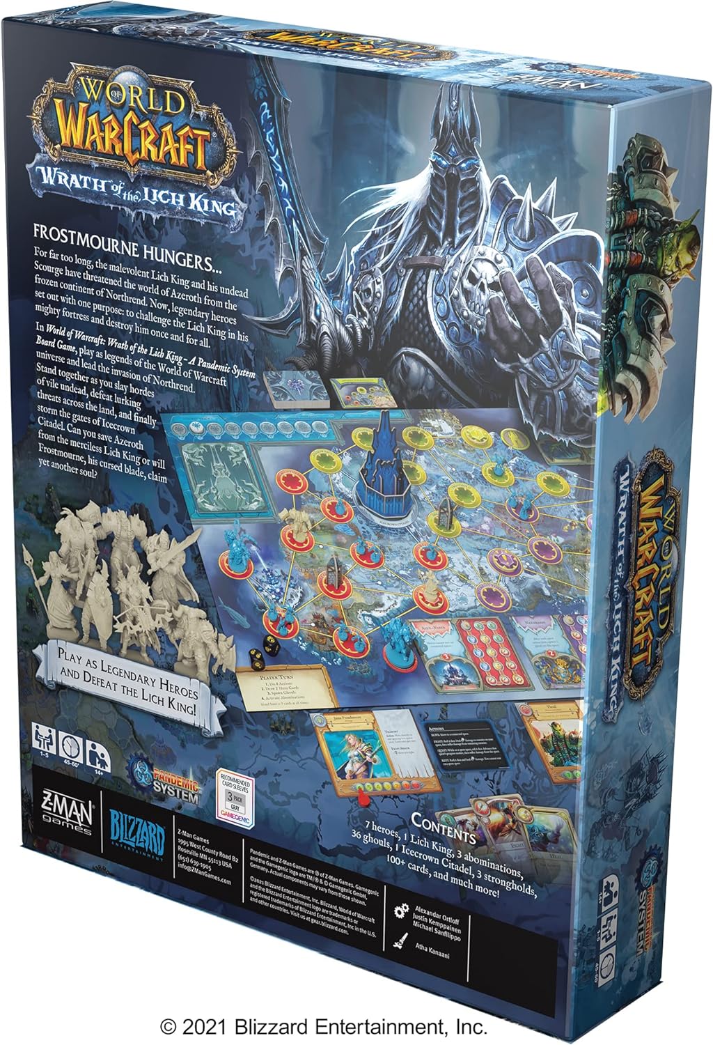 In World of Warcraft: Wrath of the Lich King, players journey to the frozen continent of Northrend to face the armies of the Lich King. This "Pandemic System" game showcases familiar mechanisms and gameplay, now tweaked to embrace the setting of the Wrath of the Lich King. Forts, temples, battlegrounds, and more populate the game board as you and your fellow heroes journey across the cold landscape. Along the way, you'll set up strongholds, complete quests, and do battle with legions of undead.
