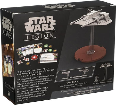 - You may be battling the Empire on the frozen wastes of Hoth, or you may be fighting on the surface of any other planet, across the thousands of planets that make up the galaxy. No matter where you are, there’s always good reason for you to get a little air superiority. The T-47 Airspeeder Unit Expansion for Star Wars™: Legion adds one T-47 airspeeder miniature to your Rebel armies. Along with the beautifully sculpted, unpainted miniature, you’ll find all the unit cards and upgrade cards that you need to make the T-47 airspeeder a crucial part of your battle for freedom.