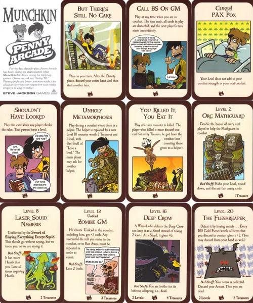 - This set contains 15 cards (11 Doors and 4 Treasures) for Munchkin, drawn by Mike Krahulik the artist for the Penny Arcade webcomic, and designed by Steve Jackson the creator of Munchkin. The cards reference characters and situations from Penny Arcade. The card mechanics, however, are different than the norm, so this set will add variety to any Munchkin game.