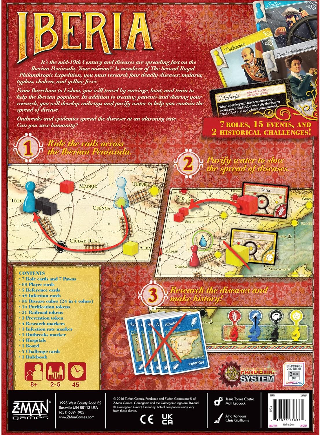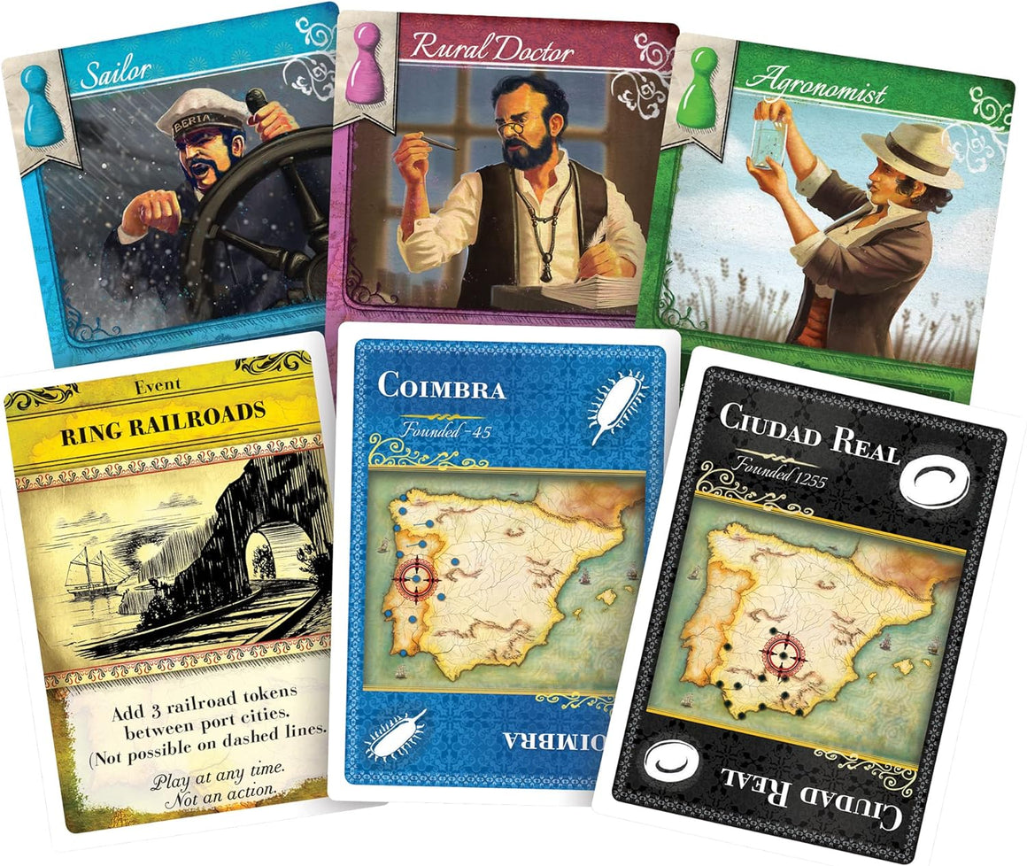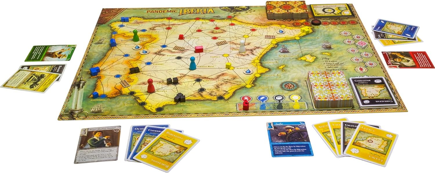 - STRATEGY BOARD GAME: In Iberia, your goal is to research how to stop the four illnesses from spreading. Use cards whose colors correspond to researched illness cubes to clean water in surrounding areas and bring you one step closer to victory.