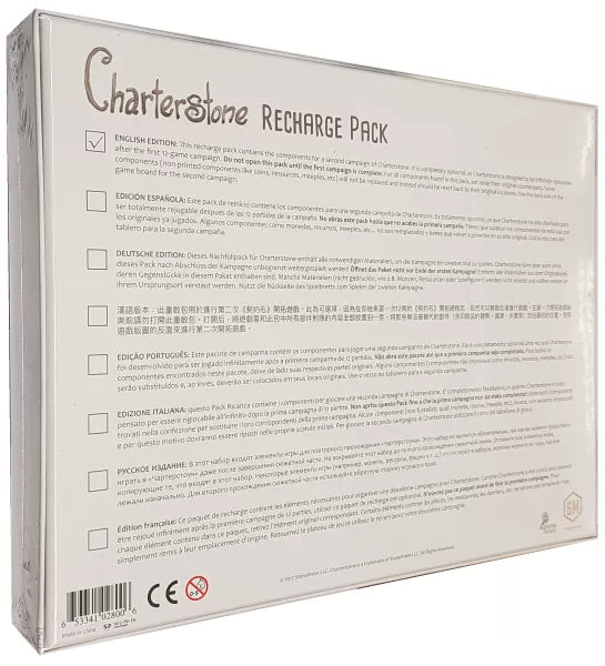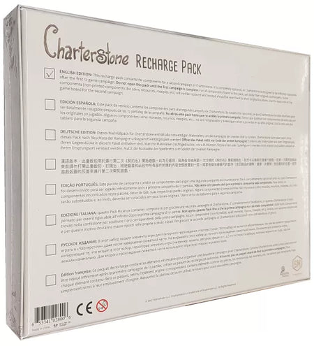 - The Charterstone Recharge Pack contains the components for a second campaign of Charterstone. It is completely optional as Charterstone is designed to be infinitely replayable after the first twelve-game legacy campaign.
