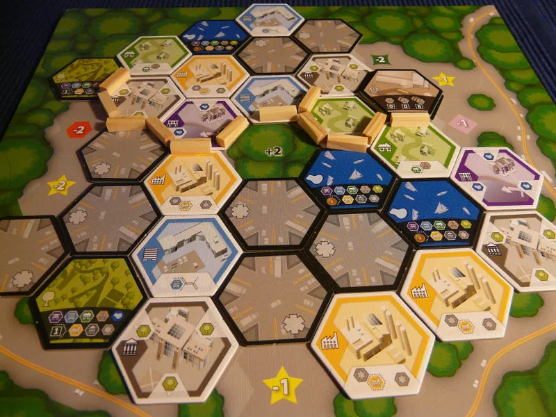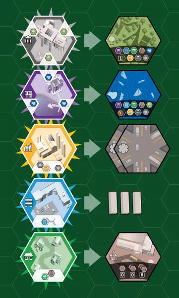 - In the game, each player starts with a subdivision player board and a hand of hex-shaped zone tiles. A parcel die is rolled to indicate the type of parcel where a zone tile may be placed, and all players simultaneously place one of their tiles. If a zone tile is placed next to existing zone tiles, those existing tiles have the ability to create new improvements, which may also be placed at this time. Those improvements provide money and points, while slowly covering up as many parcels as possible. Players pass the remaining zone tiles in hand to their left, then someone rolls the parcel die once again. This continues until only one zone tile remains in hand, which is discarded.