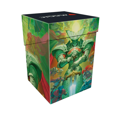 The Magic: The Gathering®—FINAL FANTASY™ Summon: Knights of Round 100+ Deck Box card storage container features vibrant, full-color artwork and includes one deck divider. Made with archival-safe, non-PVC, rigid polypropylene materials, you can store up to 100 double-sleeved cards with confidence. The self-locking lid keeps your cards securely stored when not in use, while also offering easy access. Sized for standard-size trading cards.