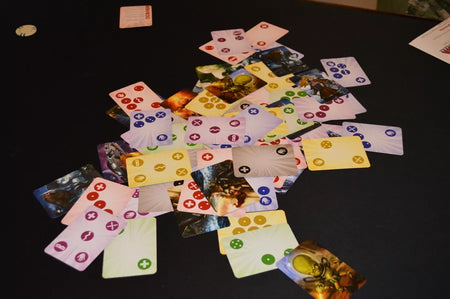 - Each player has an individual deck of cards, and they take turns throwing the cards onto a shared playing area to try to cover up the icons of opponents' cards while keeping their own icons visible. On each turn, you draw one card from your deck and throw one card – but if you have the right icons in play, you'll draw more cards, throw more cards, steal cards from opponents and dump them in the gutter, break free of the shared playing space in order to keep from being covered, and – perhaps most important of all – score points each turn you have enough visible icons in play. After all the cards have been tossed, whoever has the most points wins!