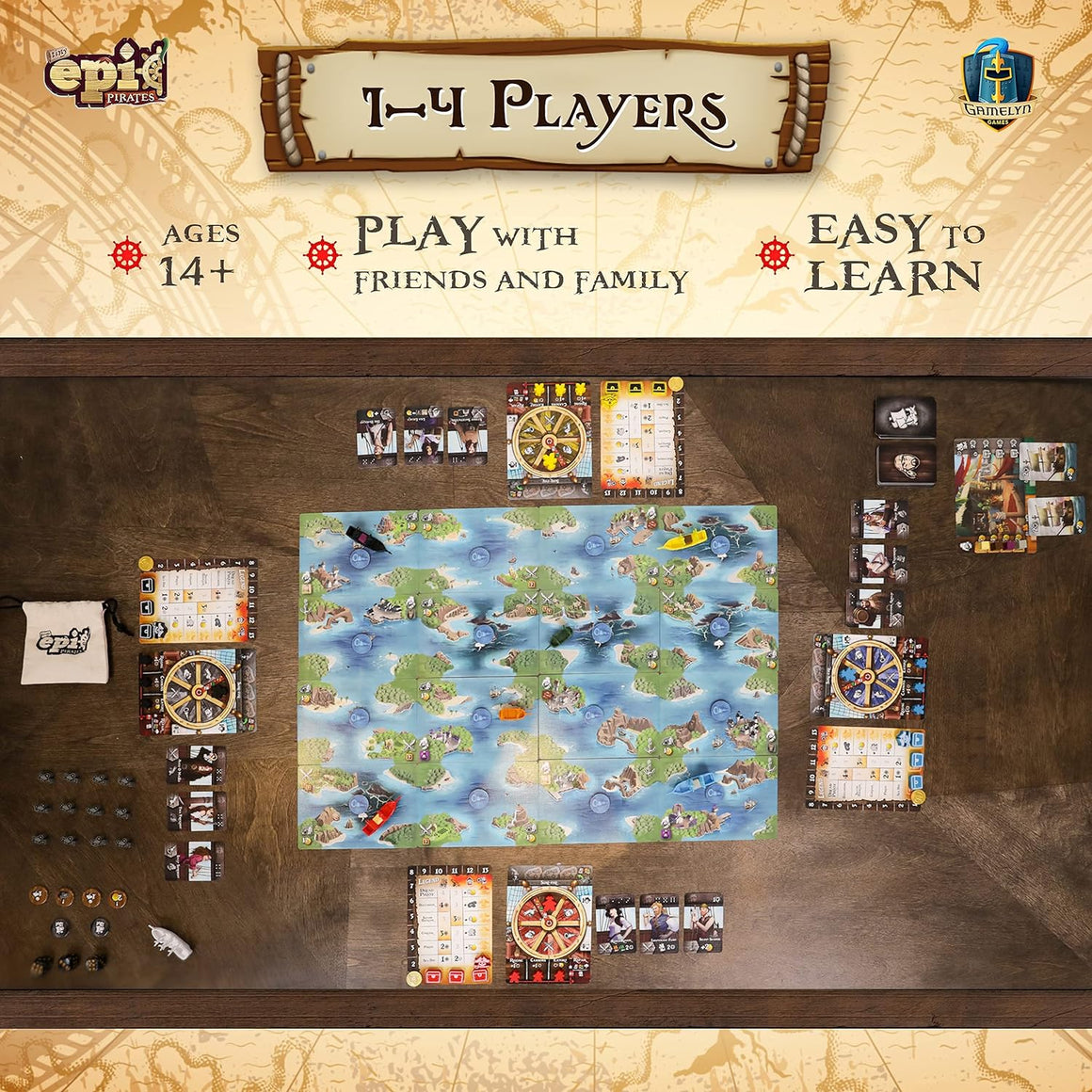 Tiny Epic Pirates is a 45 minute, 1-4 player game of high-seas adventure, utilizing a variable rondel action system and action combo-ing!. In Tiny Epic Pirates you take control of a Pirate ship with the goal of burying vast amounts of wealth on secret island hideaways.