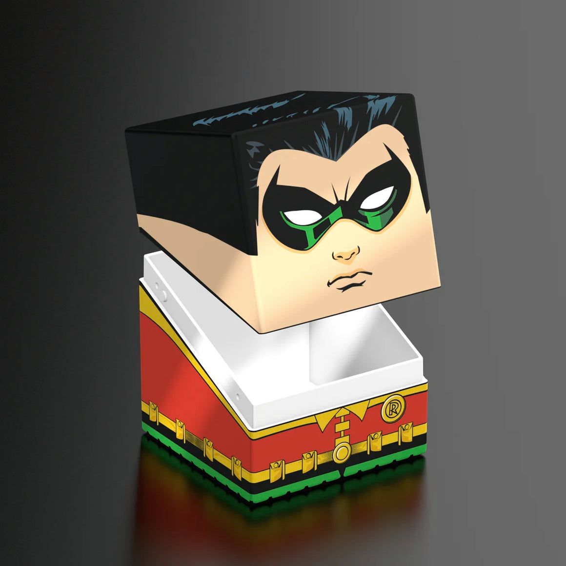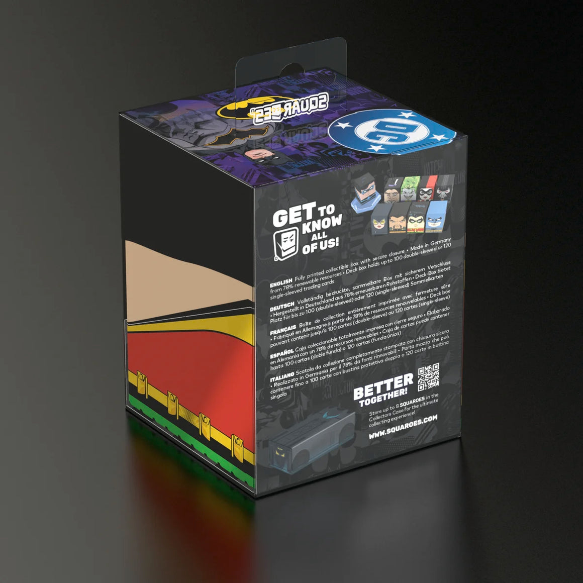Collectible box for storing TCG decks, tabletop gaming accessories, and/or collectibles. The Robin Squaroe from the Batman: Gotham City edition holds up to 100 cards in double protective sleeves if used as a deck box. Squaroes are made from 78% renewable resources and fit perfectly into the separately available Collectors Case.