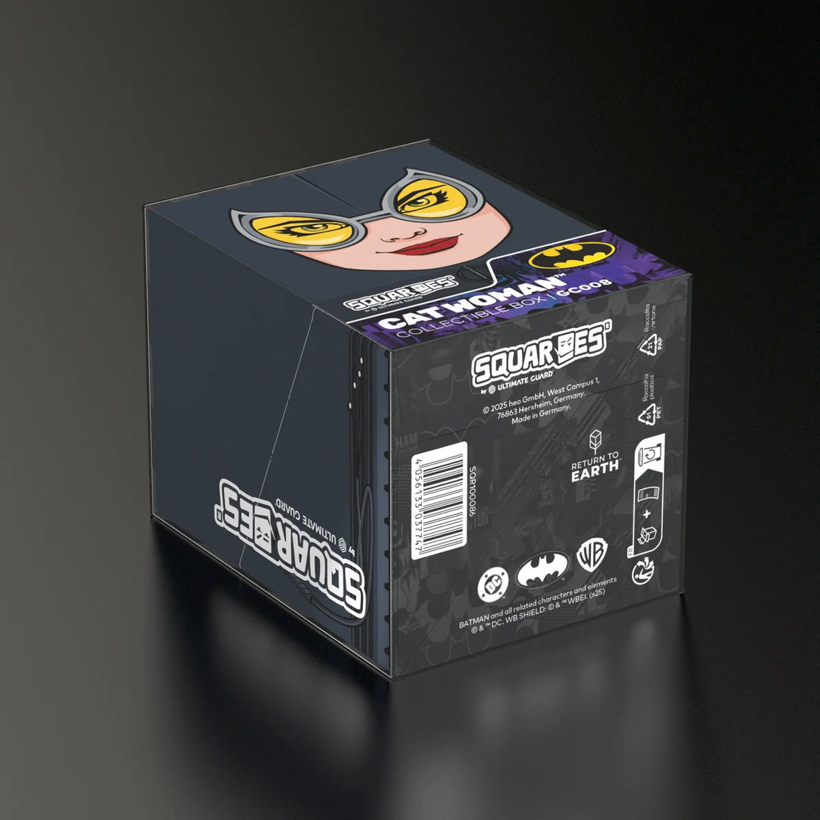 Collectible box for storing TCG decks, tabletop gaming accessories, and/or collectibles. The Cat Woman Squaroe from the Batman: Gotham City edition holds up to 100 cards in double protective sleeves if used as a deck box. Squaroes are made from 78% renewable resources and fit perfectly into the separately available Collectors Case.