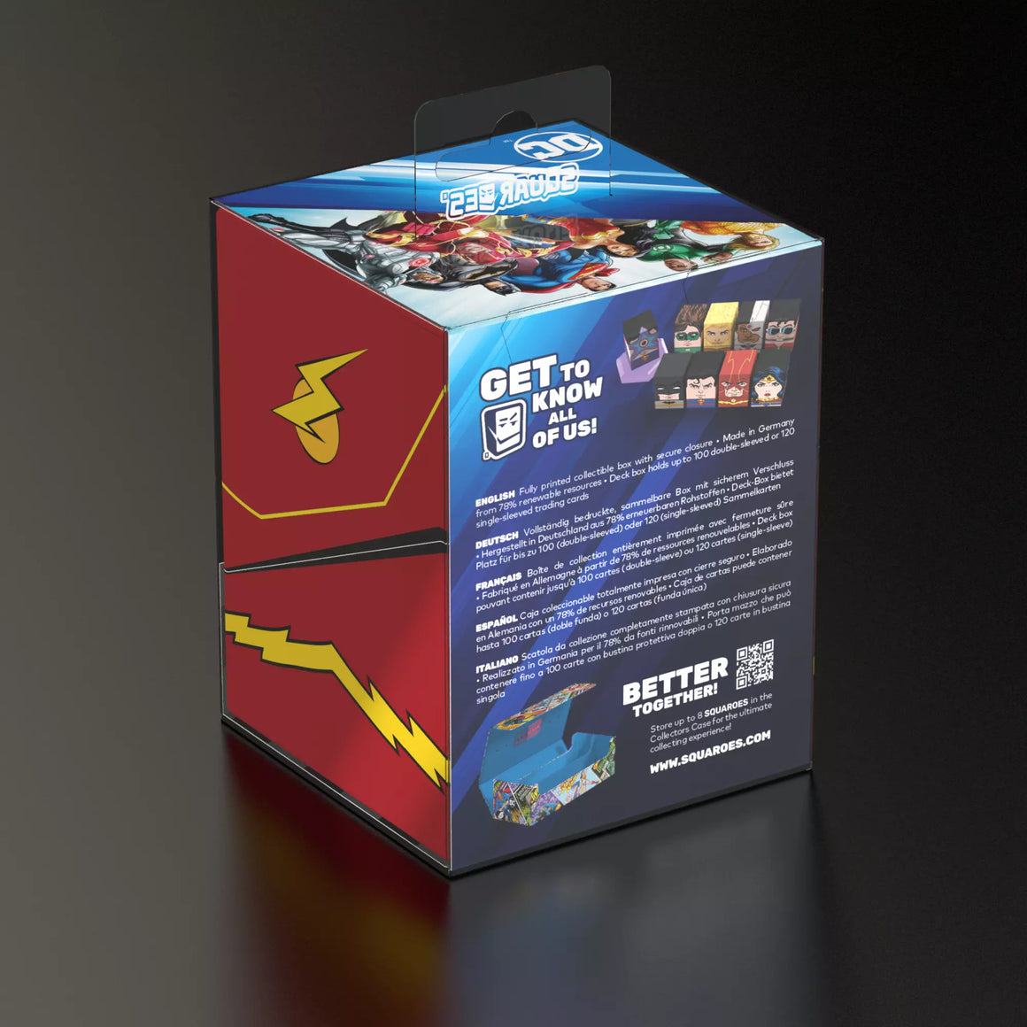 It's best to act superhumanly fast and get the Squaroe from The Flash™ before you're left out in the cold again! Whether as a stand-alone collector's item or as a storage box for trading cards: Squaroes combine awesome design with practical applications. The box, made from 78% renewable materials, fits for example a TCG deck with 100 cards in a double protective sleeves. Incidentally, The Flash™ Squaroe has this in common with those of the other members of the DC JUSTICE LEAGUE™, which are also waiting to be discovered!