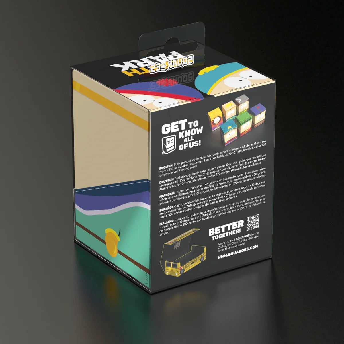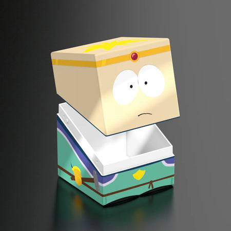 Collectible box for storing TCG decks, tabletop gaming accessories, and/or collectibles. Each Squaroe from the South Park™ edition holds up to 100 cards in double protective sleeves if used as a deck box. Squaroes are made from 78% renewable recources and fit perfectly into the separately available Collectors Case.