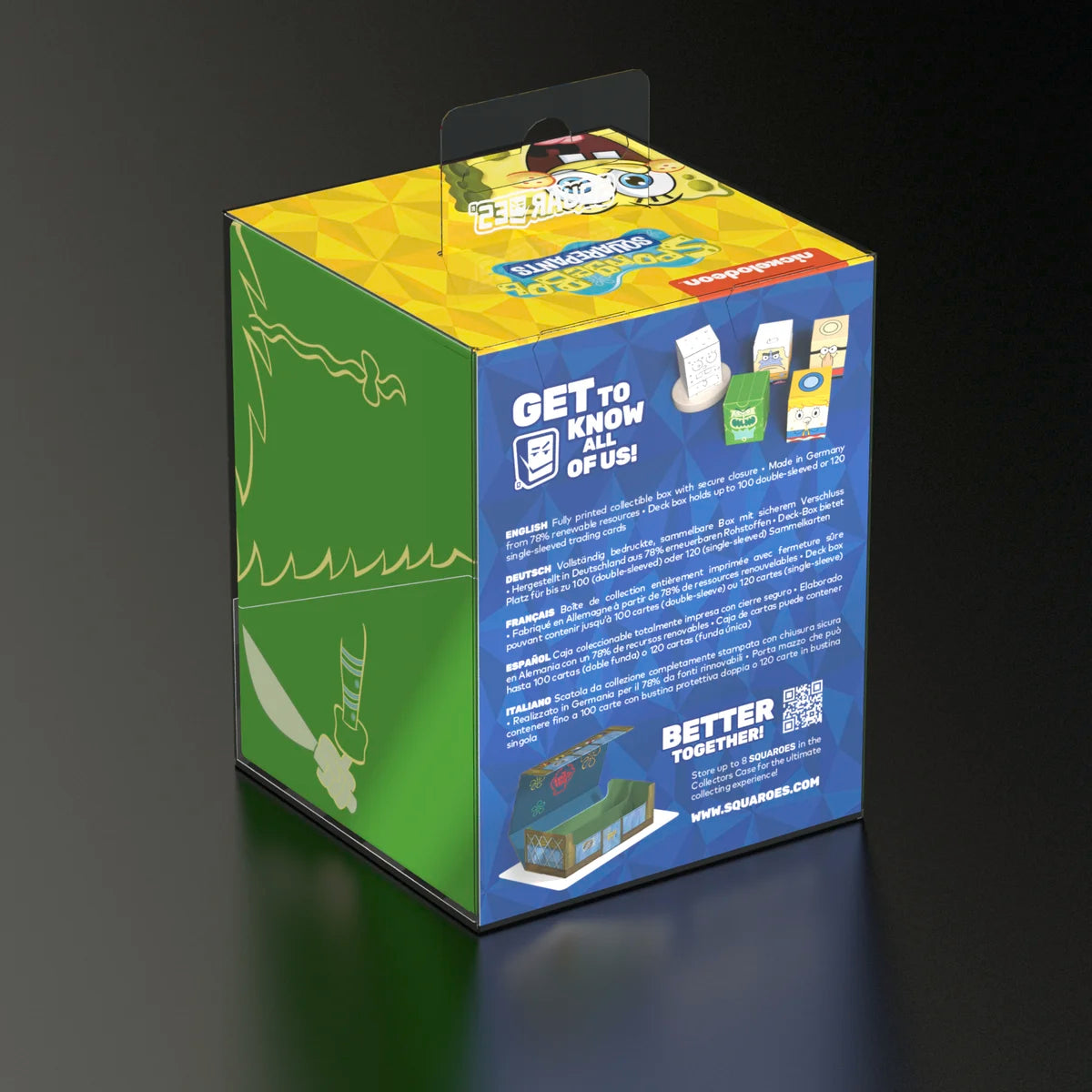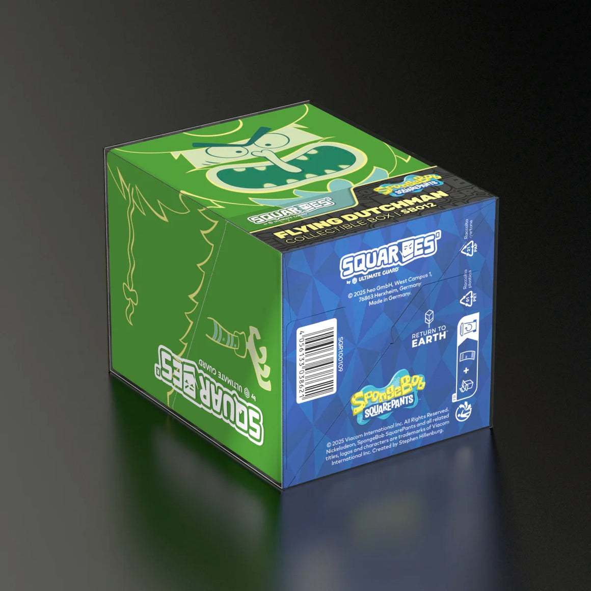 Collectible box for storing TCG decks, tabletop gaming accessories and/or collectibles. The Flying Dutchman Squaroe from the SpongeBob SquarePants™ edition holds up to 100 cards in double protective sleeves if used as a deck box. Squaroes are made from 78% renewable recources and fit perfectly into the separately available Collectors Case.