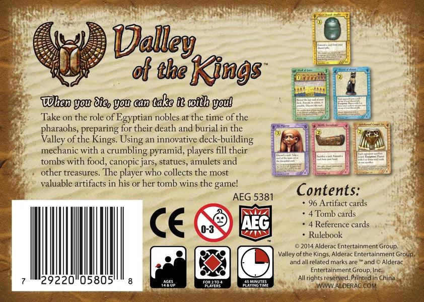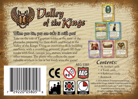 - Take on the role of Egyptian nobles at the time of the pharaohs, preparing for death and burial in the Valley of the Kings. Players want to fill their tombs with food, canopic jars, statues, amulets and other treasures, and to do so they acquire cards that are laid out in the shape of a pyramid; purchase cards at the base of the pyramid, and it "crumbles" to bring cards higher in the pyramid to the base where they can be bought. The pyramid resets each round with new offerings.