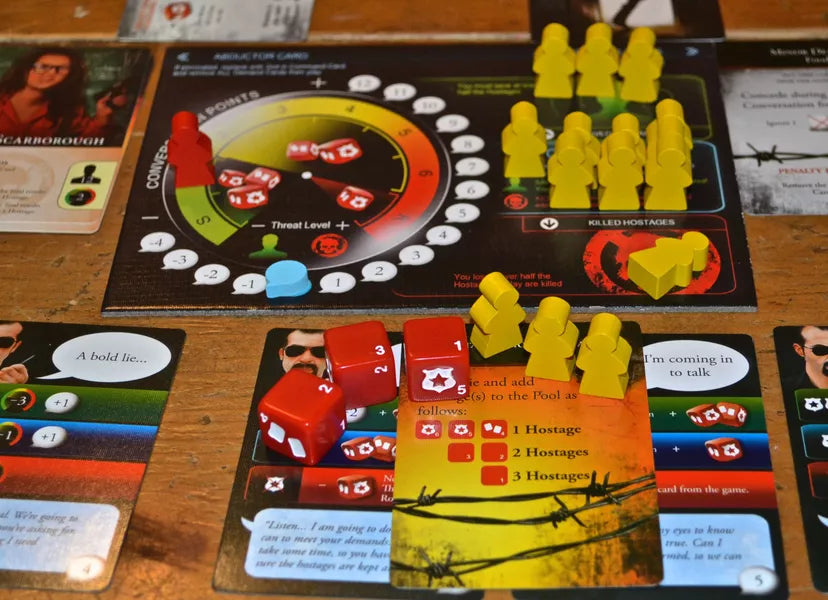 - Each turn represents a conversation between you and the hostage taker. Play cards and roll dice to increase conversation points, decrease the threat level, and release hostages.