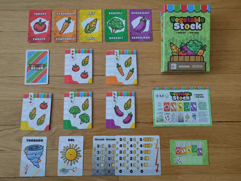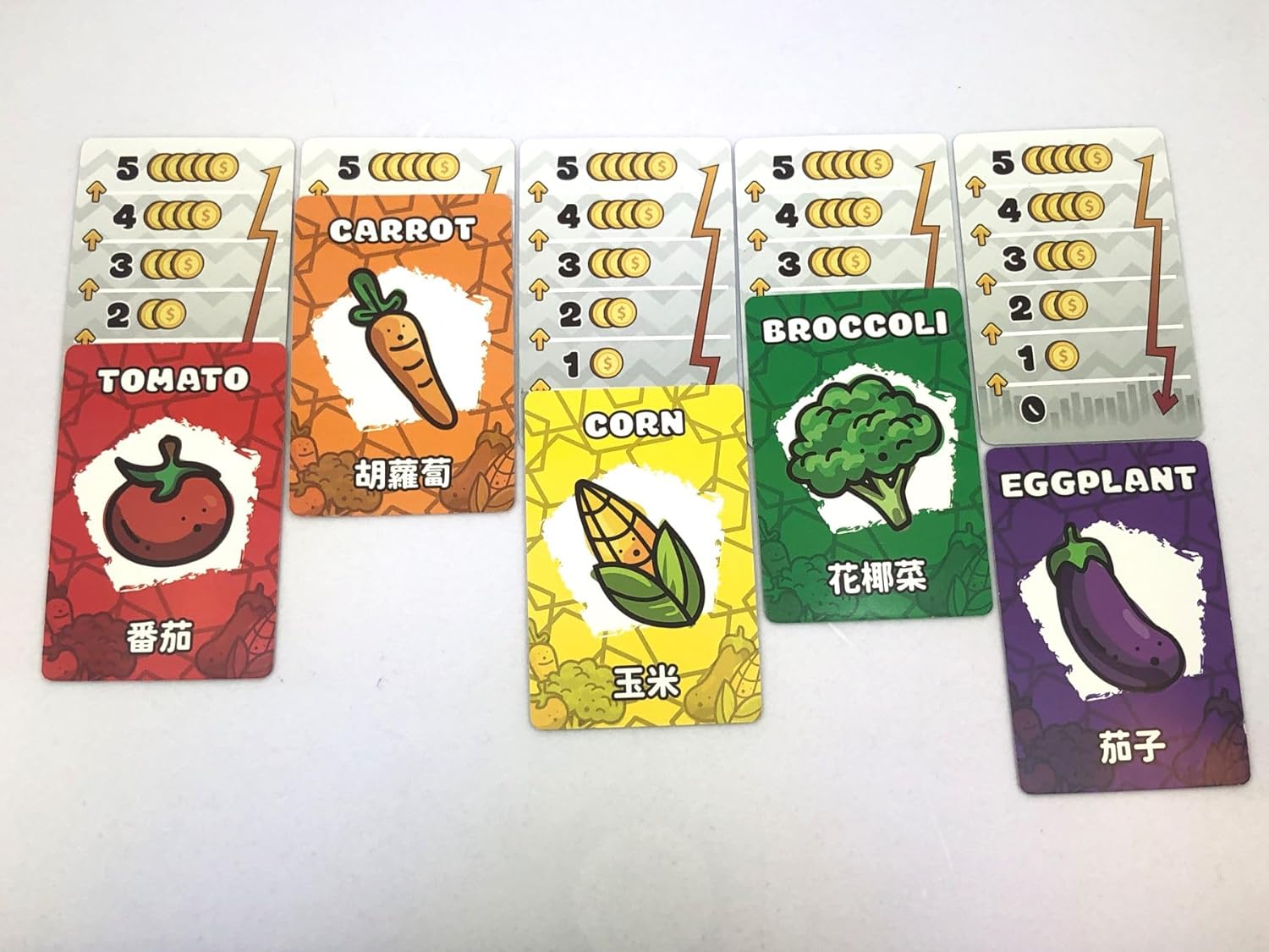 - Vegetable Stock, which debuted as Small Farmer, is a simple card game about vegetable economics. Each round, reveal one more card than the number of players on the table. Each card has three vegetable icons on it, with vegetables coming in five types. Players take turns choosing one of the cards and placing it in their harvest pile face down. The price of the vegetable(s) on the card not chosen goes up — but if the price goes too high, it crashes, although it can rise again next round.