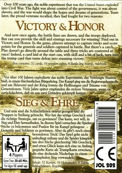 - Victory & Honor is a American Civil War -themed trick-taking game from Ty Douds and Jolly Roger. It's for four players, and while it can be played individually, it's probably best played as two pairs. That's the way I've played it.