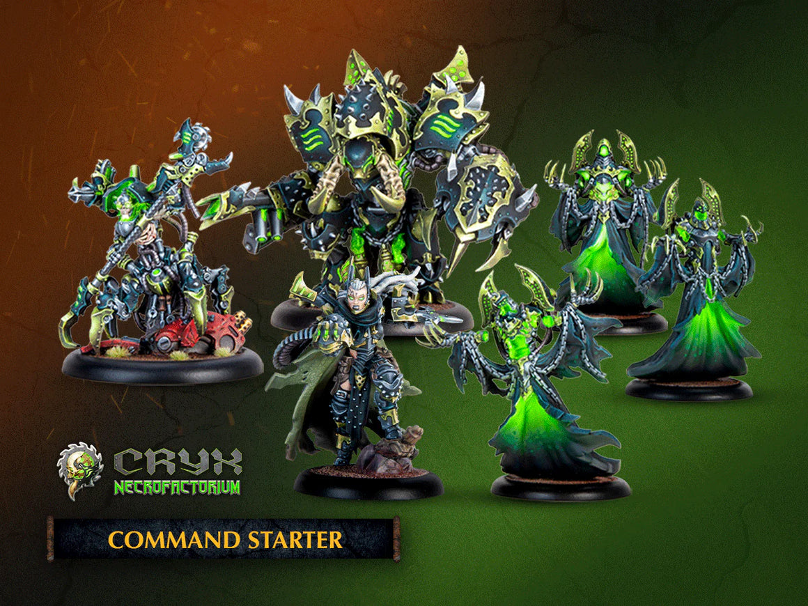 The perfect way to start building a Cryx Necrofactorium army the Cryx Necrofactorium Command Starter includes a 30 point force thata?€TMs ready to play out of the box. Commanding your unholy strike team is Wraithbinder Nekane who can suffer damage to cast spells or boost rolls.A?