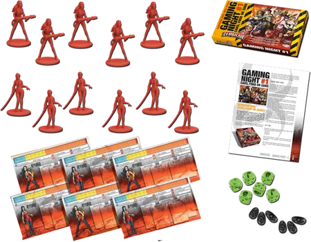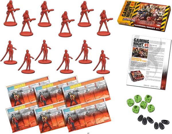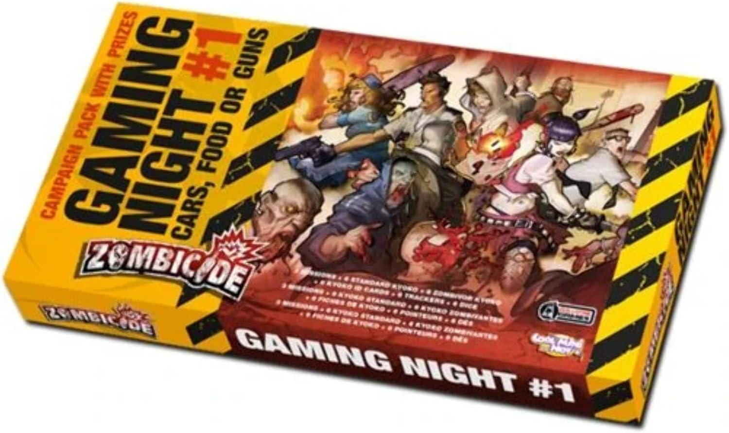 - These are boxes specially made for retailers, containing a three-mission campaign with special "gaming night" rules, exclusive dice and miniatures. All you need to have a nice Zombicide night! The first Gaming Night Kit is called "Cars, Food or Guns" and features the famous Kyoko. Your team has to choose what's best for survival among the three options, and play accordingly. When the dawn finally comes, you may come home with prizes!